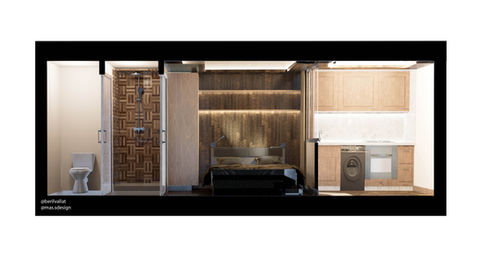 Ainsi, l'appartement présente un long couloir qui distribue les flux vers les espaces de rangement, la salle de bain, le bureau et les chambres. Les trois couchages sont séparés du salon/cuisine, et un bureau est également intégré. L'espace de vie est judicieusement placé pour profiter de la lumière naturelle au maximum, et afin d'éviter des chambres sombres, la cloison de séparation est pourvue de fenêtres intérieures qui laissent passer la lumière naturelle.